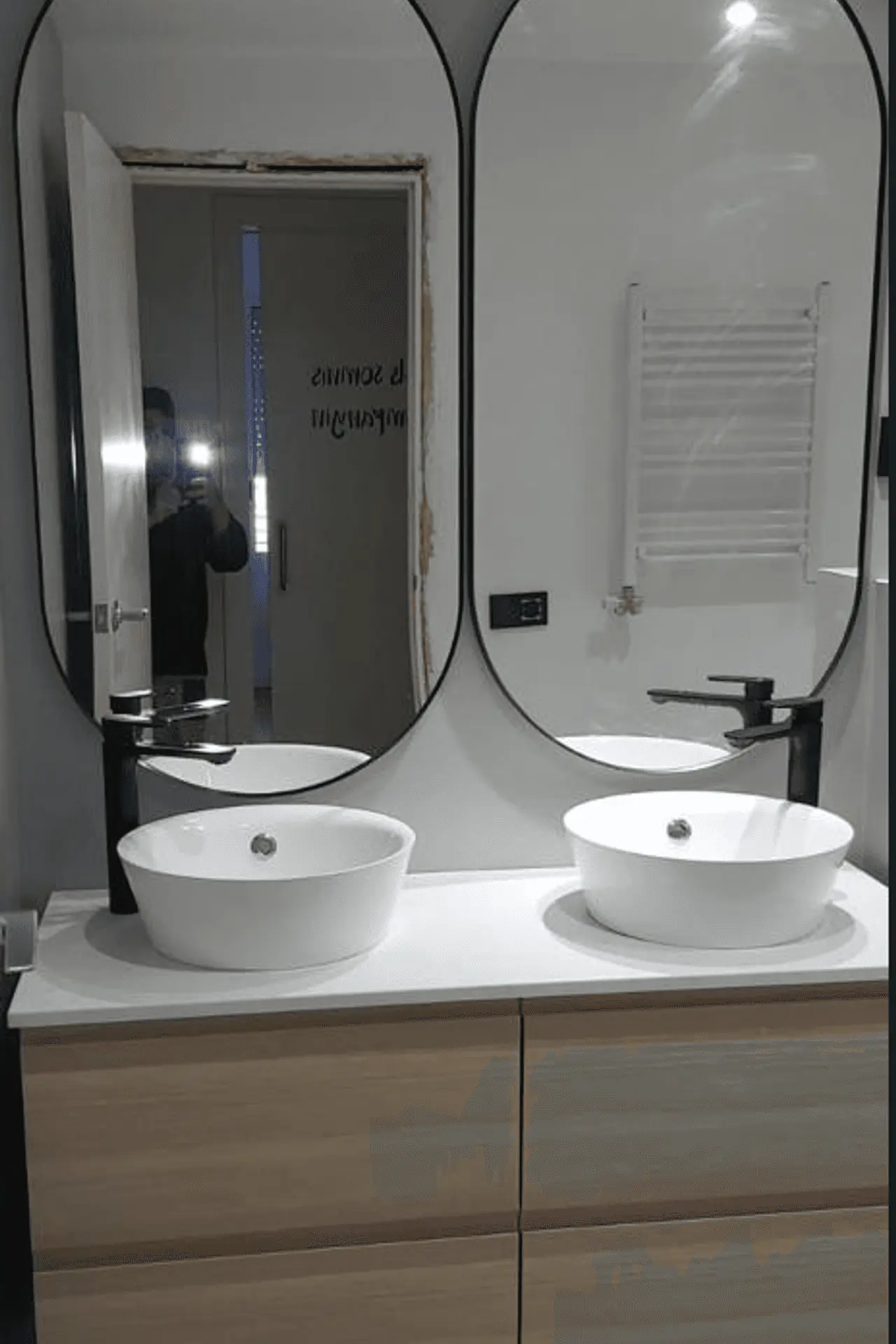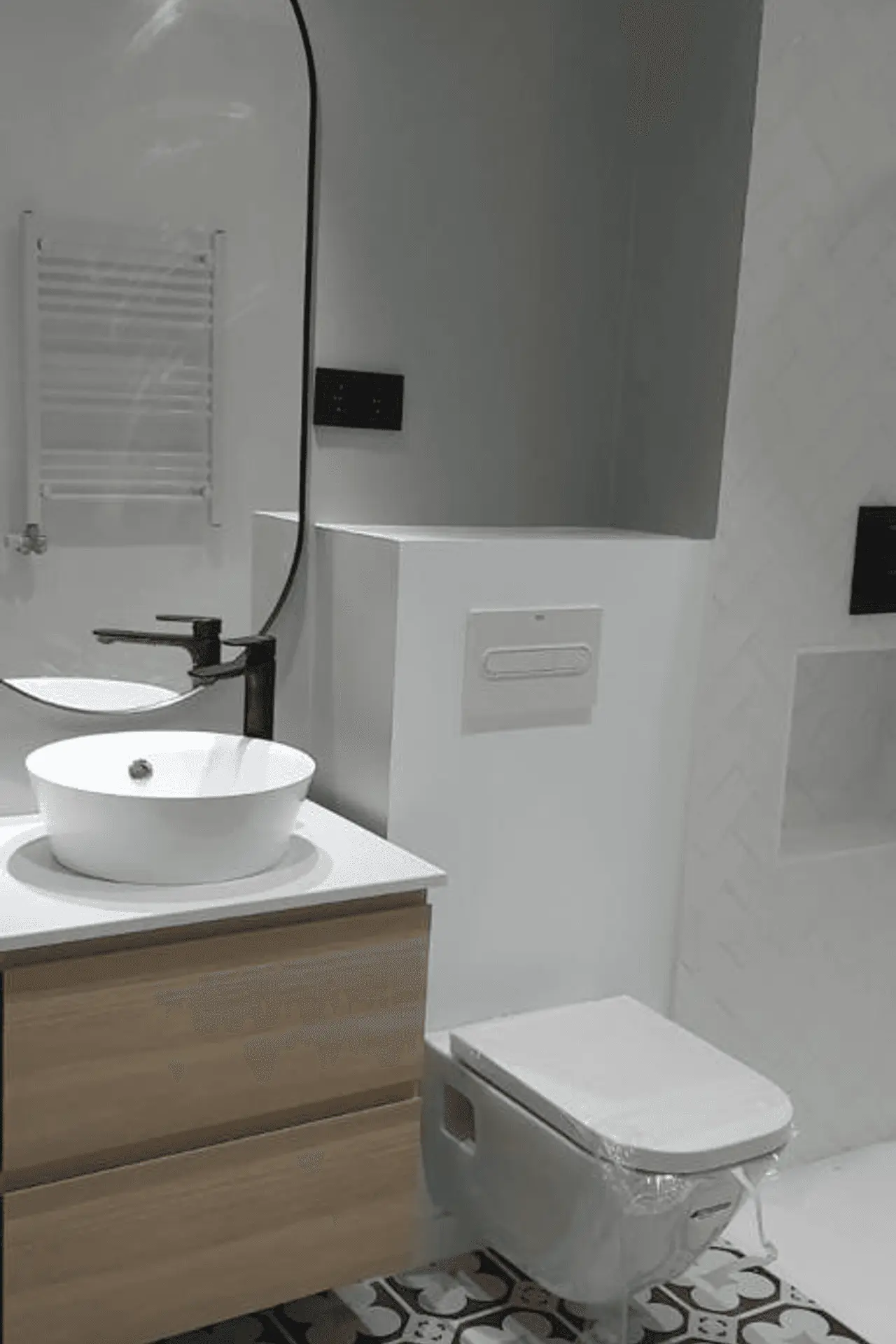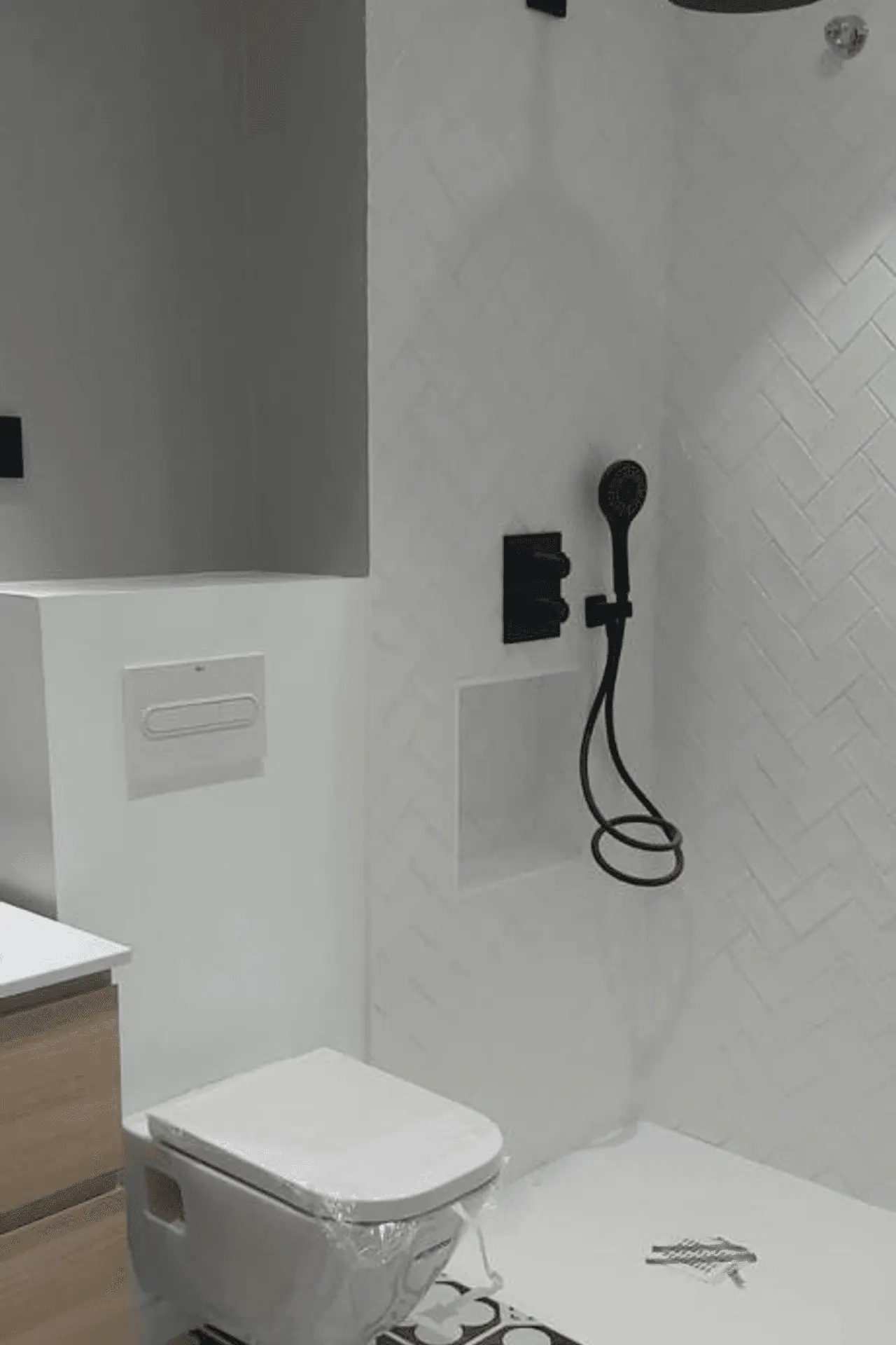 Extras: Doble espejo vertical con marco negro, grifería negra mate, hornacina en zona de ducha